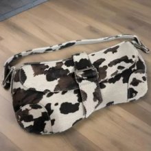 Absolutely smitten by this vintage-style shoulder tote! The cow-print design adds such character while also being super stylish right now. Its lightweight canvas body ensures durability without sacrificing comfort or style.