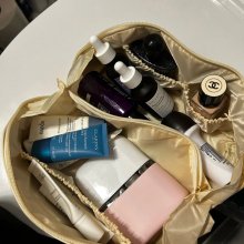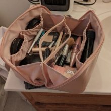 I've been using a clear plastic tub to organize my makeup for years, and I finally decided to invest in something new to keep everything in order. This bag was perfect! I bought the medium size since they were out of the large one, but it holds everything I need, including my big bottle of Micellar water. It will be great for keeping my cabinets organized and for travel as well. I'm hoping it will last and not deteriorate over time.