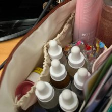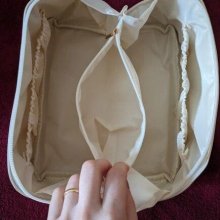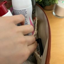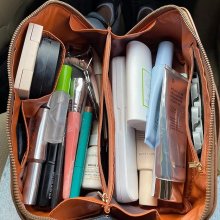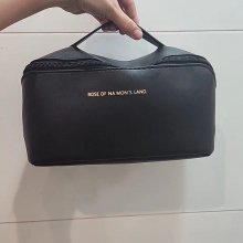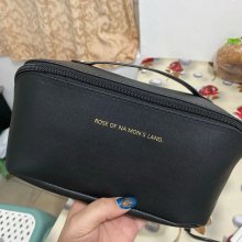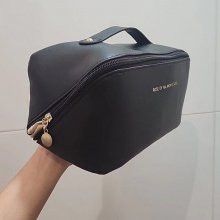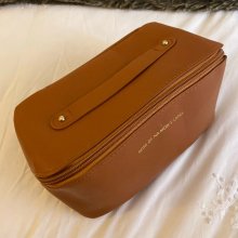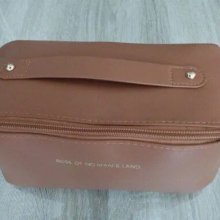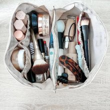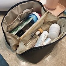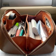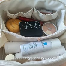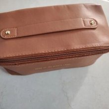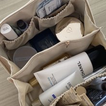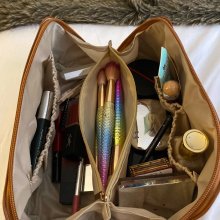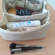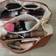 I think this makeup bag works for me because my makeup is always organized and very easily accessible. All the pockets are very useful for my hair products, lipsticks, safety pins, and many other small things that I would loose without the pockets. The only thing I don't like is the plastic compartment. I wish it was more stitched in so things from the other side would not slide over. When I took this makeup bag traveling, the material was very nice that traveling was not a problem. When I got back from my travels, I was able to easily wipe off the makeup I got on the bag.