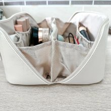 Has a lot of capacity. It's like in the photo. Only. I wish I had two on both sides to zip up. Would be more practical when opening and closing the toiletry bag.