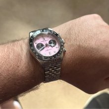 This watch is pure class! Love the unique panda dial and how it glows in low light. It's also waterproof which is great because I'm always on the move.