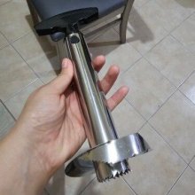 This is safer and faster than using a knife. It took me a few minutes to assemble and test, but once I got the hang of it, it worked flawlessly on two pineapples. Just ensure the cut ends are straight and flush before inserting the tool into the pineapple. The cutter pulls out with ease, but it might be a bit challenging for older users. For them, I suggest using a lower cutting table for easier pushing and pulling. Alternatively, laying the pineapple on its side and pulling the cutter out horizontally can be easier for those with less upper body strength