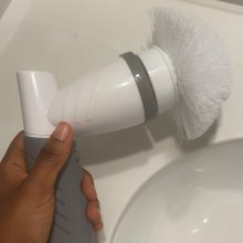 Despite its small size, this gadget does a great job at cleaning. You need to be gentle with it, as pressing too hard can stop it from spinning. I still use a pumice stone for some tough spots, but overall, this tool is fantastic. It has turned cleaning the bathroom from a chore into a fun activity and reduced my cleaning time significantly.
